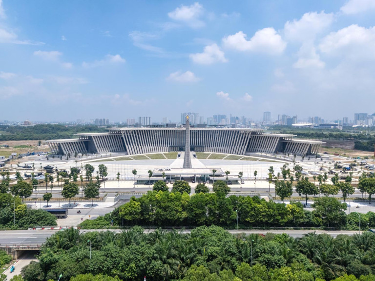 Tọa lạc tại trung tâm của một công viên rộng 38,6 ha, bảo tàng nằm trên đỉnh đồi, tựa như một tán cây khổng lồ che bóng mát và kết nối liền mạch không gian trong nhà và bán ngoài trời với cảnh quan thiên nhiên. Một hàng cột cao 25m uốn lượn 300m dọc theo ngọn đồi xanh mướt, tạo nên sự chuyển tiếp uyển chuyển giữa trong nhà và ngoài trời. Các cột trụ nghiêng dần ra ngoài 25 độ, gợi lên hình ảnh những cánh tay giơ lên cao đầy kiêu hãnh, trong khi các mái vòm cong gợi nhớ đến chiếc nỏ thần kỳ huyền thoại của Việt Nam – biến những biểu tượng quân sự thành một kiến trúc hòa bình.