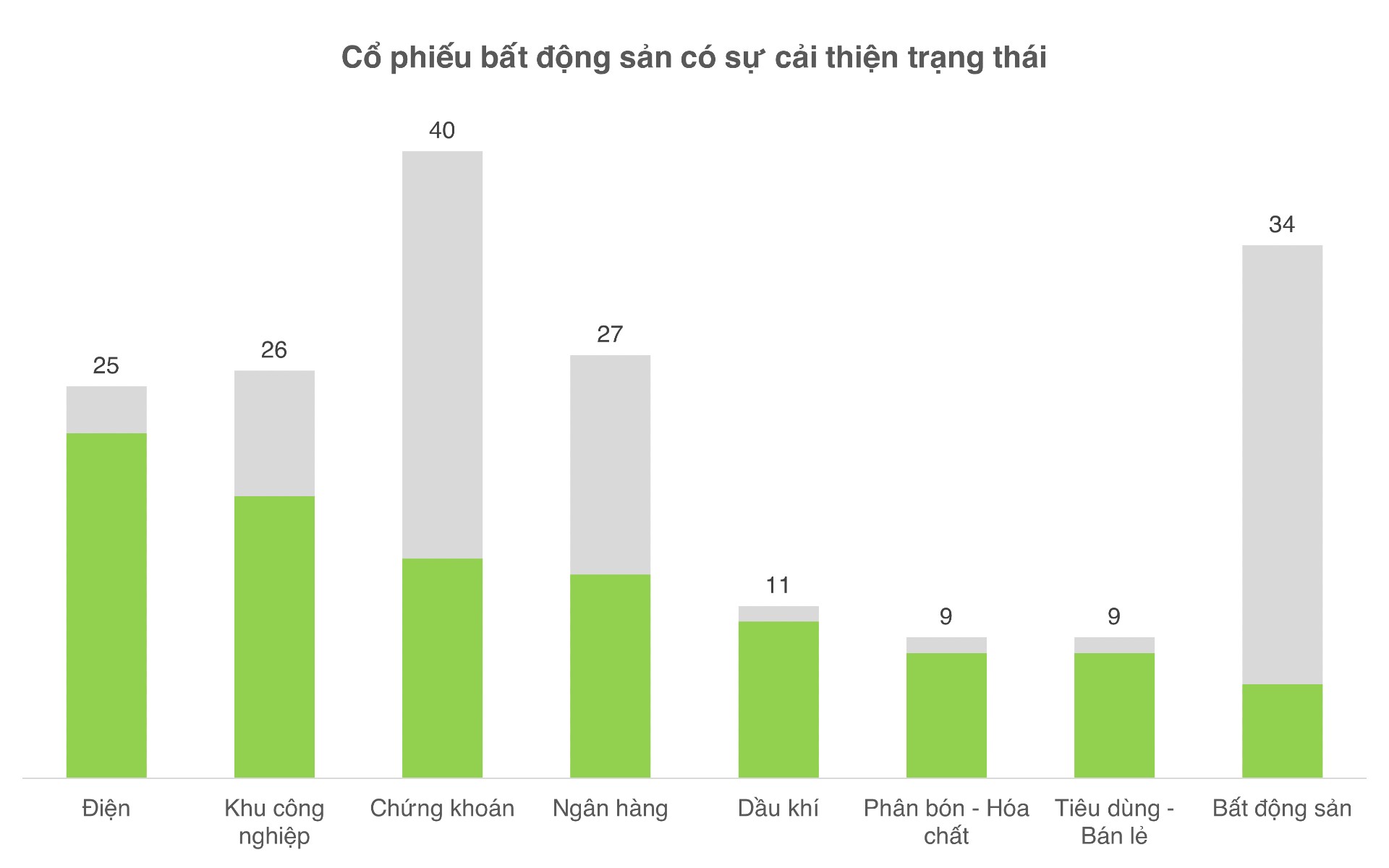 Tuy nhiên tín hiệu hồi phục bước đầu đã xuất hiện, khi tỉ lệ cổ phiếu bất động sản có mức tăng vượt VN-Index đã cải thiện, hiện chiếm khoảng 18% số mã trong ngành.